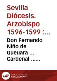 - Don Fernando Niño de Gueuara ... Cardenal ... Arçobispo de Seuilla ... Hazemos saber ... como el Licenciado don Alonso de Erasso ... Oydor en la Real Audiencia y Chancilleria de Granada ... gano un Breue y letras Apostolicas de Nuestro muy Sancto Padre Clemente ... Papa Octauo ... para que en la ciudad de Ecija y su districto se celebre el Officio y Missa del Bienauenturado Sant Crispino Obispo... [Mandamiento de Don Fernando Niño de Guevara, Cardenal Arzobispo de Sevilla para que en la ciudad de Ecija y su districto se celebre la fiesta de Sant Crispino Martyr y Obispo della...]