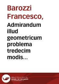 - Admirandum illud geometricum problema tredecim modis demonstratum, quod docet duas lineas in eodem plano designare, quae nunquam inuicem coincidant, etiam si in infinitum protrahantur, & quantò longiùs producuntur, tantò sibi inuicem propiores euadant / Francisco Barocio ... Veneto autore; accessit etiam instrumentum quoddam ab eodem autore inuentum, quo cuiuslibet coni ortus, ac trium conicarum sectionum in plano descriptio fit...