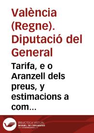 Tarifa, e o Aranzell dels preus, y estimacions a com dehuen passar, y estimarse totes les robes, y mercaderies que entraran en lo present Regne, en los anys 1628 y 1629 : conforme los quals preus ... se deurà pagar lo dret nou de general de entrada, imposat pera la paga del seruici offert a la Magestat en les Corts del Any 1626.