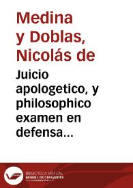 Juicio apologetico, y philosophico examen en defensa de la verdad, y mas methodica practica, o Breue enarracion sobre el exacto juicio ... para la curacion de mi señora doña Ana Egas Venegas Fernandez de Cordoba ... para desengaño de empiricos / autor don Nicolas de Medina y Doblas...