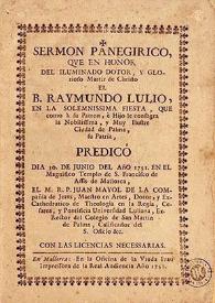 Sermón panegirico que en honor del iluminado dotor, y glorioso Martir de Christo el B. Raymundo Lulio...predicó el dia 30 de junio del año 1751...Juan Mayol...